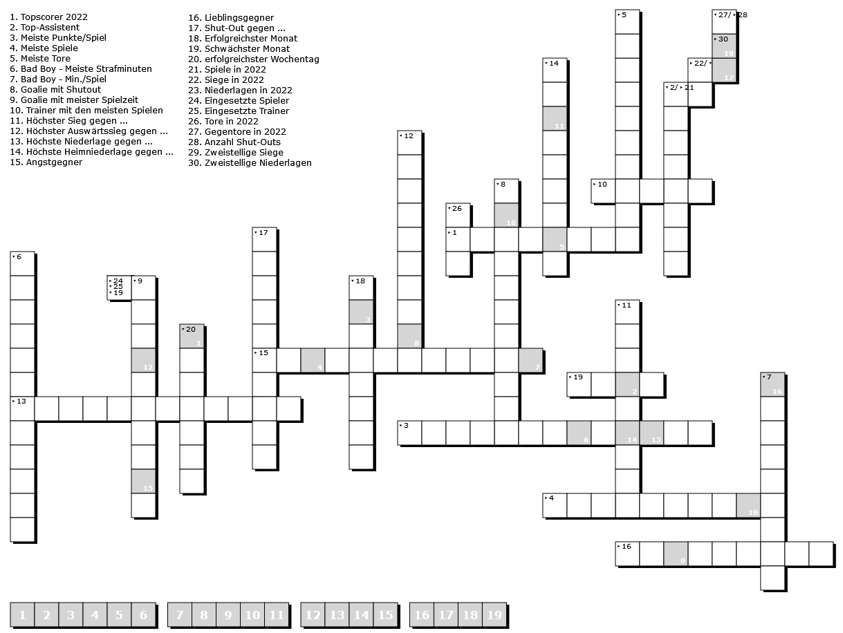 Das Jahr 2022 neigt sich dem Ende. Die Eisbären haben in diesem Jahr viel erlebt, Höhen und Tiefen, Niederlagen und Erfolge. Wir wollen diese nochmal Revue passieren lassen und haben für euch ein kleines Statistik-Rätsel mit 30 Facts aus 2022 erstellt. Wir geben euch Zeit bis zum 1. Januar 2023, das Rätsel zu lösen. Wer den Lösungssatz inkl. aller 30 Lösungen herausbekommen hat und uns die Lösung via. Instagram oder Facebook sendet, gewinnt 2 Freikarten für das 1. Heimspiel am 8. Januar gegen die Hornets. Und natürlich umfasst die Statistik alle Seniorenspiele aus 2022, LL und RL. Jetzt viel Spaß beim rätseln, alle Lösungen gibt es am Sonntag auf unserer Homepage.